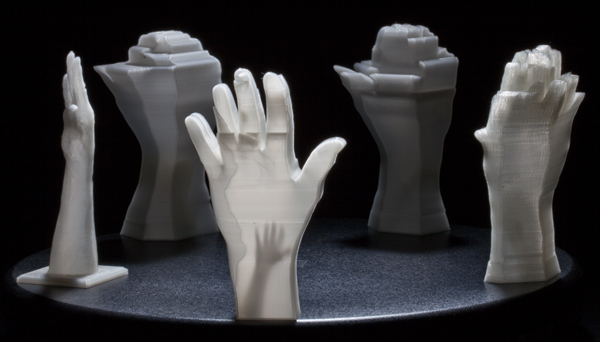 The Ascent project uses old analog photograms (Camera-less photographs) and 3D printing to imagine how that evolution might happen. The final Ascent art installation will include a life size bronze casting of the artist’s hand, twenty 10″ tall translucent 3D printed sculptures mounted on white danby marble bases, and 180 framed 14″x11″ black and white photograms. Ascent imagines 20 possible ways our hands may evolve as a result of using the technologies of the future. Man descended from apes and now humanity ascends to the digital future.