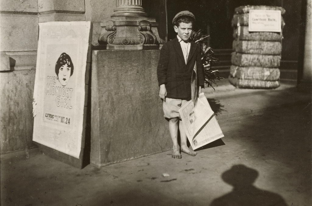 The photo above is another by the American photographer and social advocate Lewis W. Hine, whose work often documented working children. The youngster above, barefoot but otherwise fairly well-adorned, probably shouted headlines that day detailing events in war-torn Europe. The theatre advertisement to his right reads “Oct. 24,” only a few days after the Battle of Warsaw ended in German defeat. A shadow slips into the picture from the bottom right, one which you imagine probably belonged to Hine himself.
