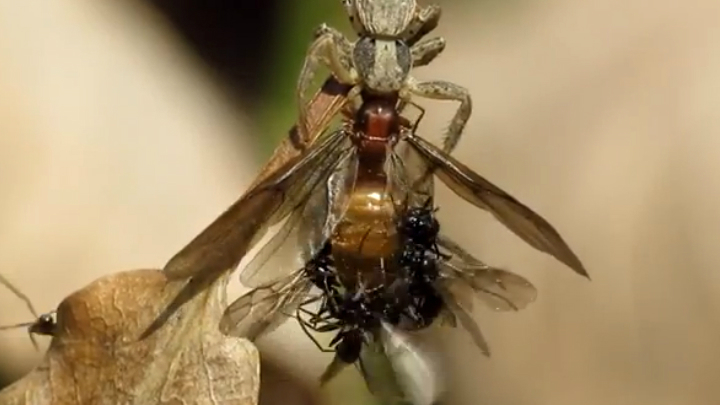 Slovakian wildlife photographer Adrián Skippy Purkart captured a queen ant being ravaged by a swarm of males while having her brain sucked out of her head by a spider. This video was posted on the Amateur myrmecology Youtube channel.