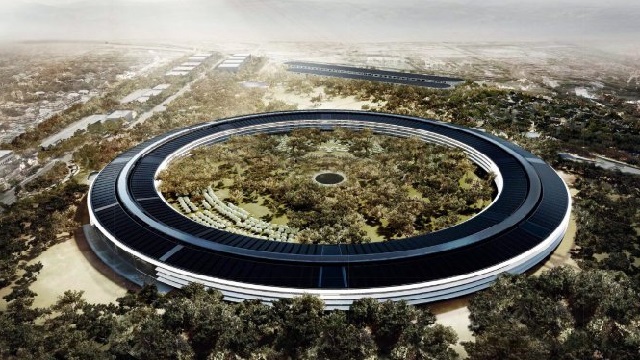 Foster’s building, officially called Apple Campus 2, will stand just one mile east of the current headquarters. The plans (which can be seen here) call for a four-story circular building of 2.8 million square feet with an extensive “orchard” green area in the middle. Thirteen thousand employees will enjoy a 3,000-seat café, 1,000-seat auditorium, fitness center, and other corporate-provided amenities. Amazingly (and expensively) every pane of glass in the building will be curved to comprise the giant circle. In accordance with the new “open” floor plan fad, there will be plenty of structurally created opportunities for workers to bump into one another and interact creatively.