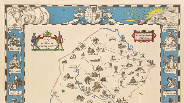 [Image:Andrew Wyeth (illustrator) and Christian C. Sanderson (compiler). Map of Historical Chester County (detail), 1937. One of 5,750 printed by Beck Engraving Company, Philadelphia, PA. Original pencil drawing hangs in Christian C. Sanderson Museum. Actual prints from the original 1937 set available for sale from the museum.]