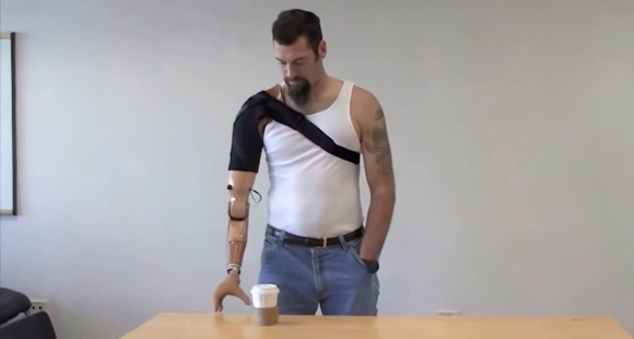 In this video, Former Army Staff Sgt. Glen Lehman demonstrates the progress of brain-interfacing prosthetic devices.