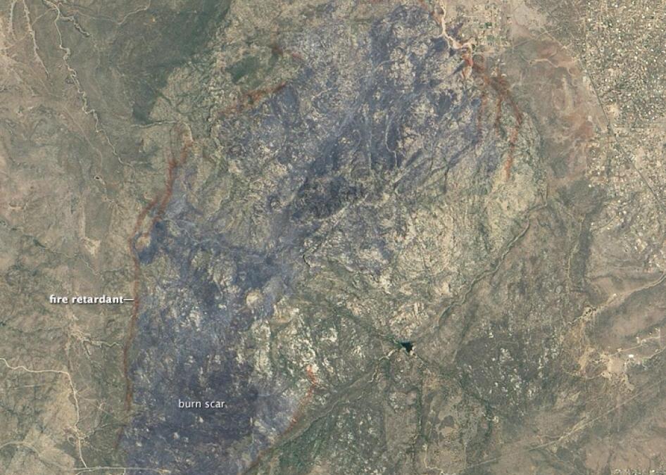 The image above shows the “burn scar” left from the Doce fire that has devastated the area around Prescott, Arizona. This natural-color image, taken from the Earth Observing-1 (EO-1) satellite, shows charred areas in grey; untouched areas in green; areas with little vegetation are tan. The rust-colored band is where 335,000 gallons of retardant was dropped by aircraft to contain the fire.