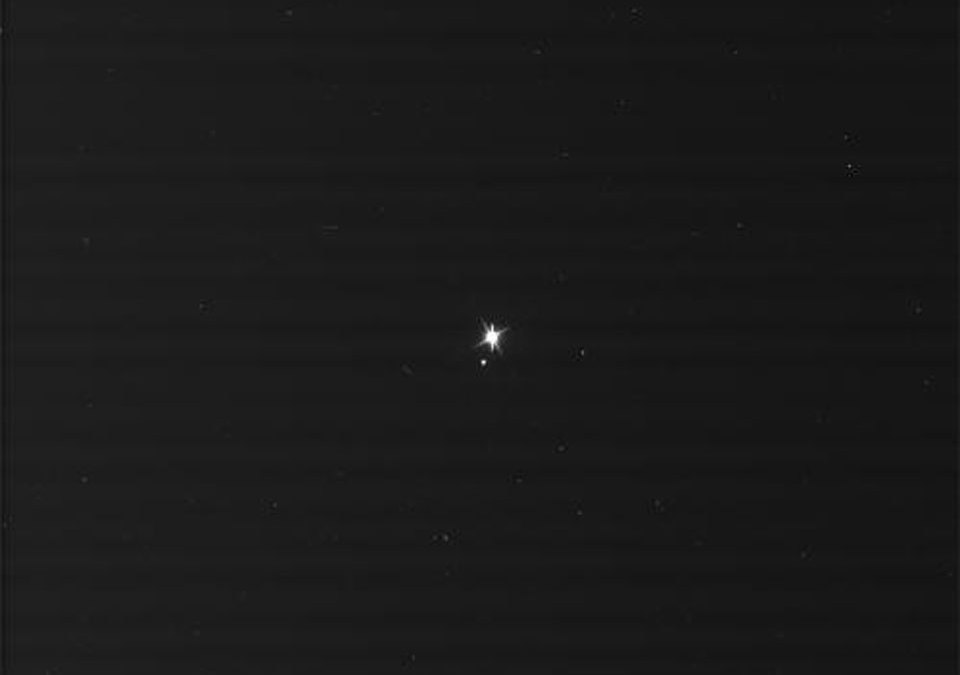 Last Friday we asked you to “wave” to Saturn, as theCassini mission orbiting Saturn would be “waving back” and taking a picture of the Earth and Moon. Here is the view from Saturn. Earth is the brighter of the two spots in the image.