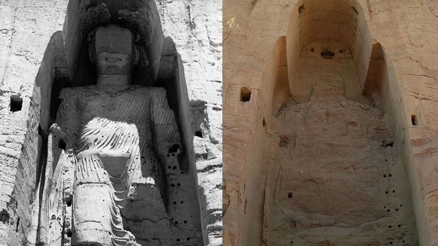 I don’t think I had ever heard of the Taliban before the news that they had dynamited the two giant Buddha statues in March 2001. Mullah Mohammed Omar ordered the “hit” after the statues (shown above, before and after the blasting) had been deemed false idols by the Taliban’s leadership. Six months later, the whole world knew about the Taliban after the events of September 11th. Taking down these statues looks now like the Taliban’s prequel to the big show in New York City and Washington, DC, something they even went so far as to film and turn into a propaganda video. Because the loss was more historic and cultural than something measured in human lives, the destruction of the Bamiyan Buddhas has been overshadowed by 9/11, at least outside of Afghanistan, until now.