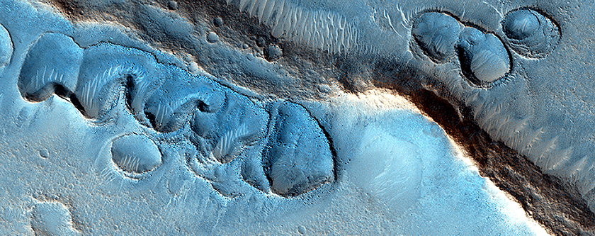 False coloring is used in this image to reveal greater detail. The image here depicts mystery martian morphology. It captured by the High Resolution Imaging Science Experiment (HiRISE) camera aboard the Mars Reconnaissance Orbiter.