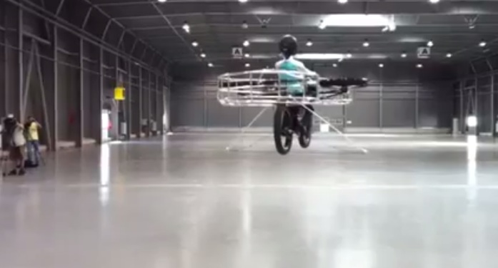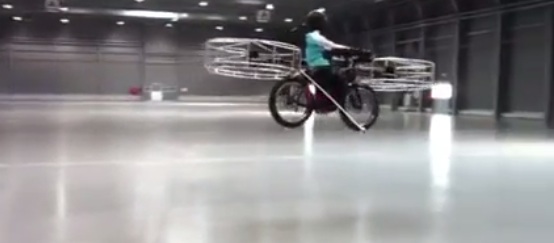 An electric bicycle took off in a Prague exhibition hall and completed a 5 minute flight and safe landing. The bike was operated from the ground by remote control. The rider on this bike is a dummy.