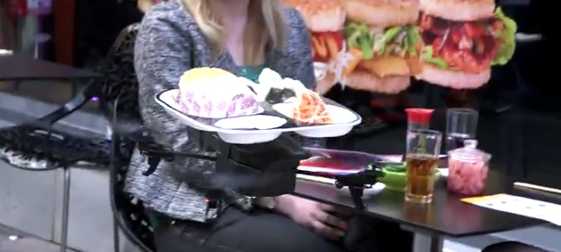According to Yo!Sushi’s YouTube channel, the gadget, called the “iTray,” is made from a light-weight carbon fibre frame and is activated by four propellers “making it incredibly nippy.”