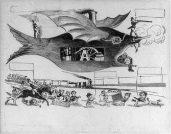 1859. Cartoon showing monstrous balloon competing with railroad train as a freight carrier.