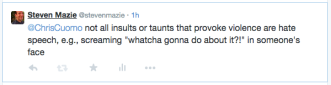 In the midst of the Twitter war he set off, Cuomo refused to back down. He kept insisting, in tweet after tweet, that he only meant to say that fighting words, supposedly a subset of hate speech, are excluded from constitutional protection. But his thinking is muddled. Some hate speech might count as fighting words: Call an African-American the n-word or a Jew the k-word to his face, in the heat of a dispute, and you can expect punches to fly.