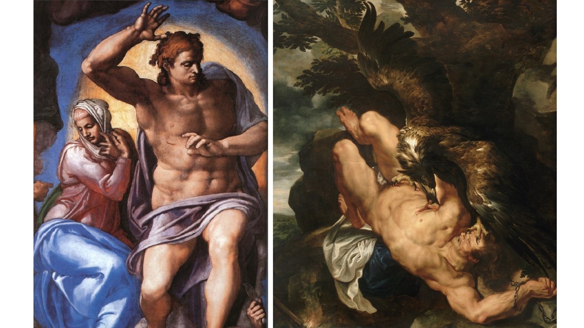 It all started with a happy accident. Coming back to his office one day, curator Christopher Atkins looked at the catalog on his desk upside-down. On the cover was Peter Paul Rubens’ Prometheus Bound, one of the most important Baroque paintings in America. Atkins noticed that, upside down, Rubens’ Prometheus bore a distinct resemblance to Christ in Michelangelo’s The Last Judgment (shown side by side above). The more he looked, the more similarities he found. The resulting exhibition, The Wrath of the Gods: Masterpieces by Rubens, Michelangelo, and Titian, examines how Rubens synthesized the imagery and styles not just of Michelangelo and Titian, but also of multiple sources from Northern European art to shape his own distinctive portrayal of gods and the god-like act of creativity. Rubens flipped the script on Michelangelo and turned a new page in art that today’s artists continue to emulate.