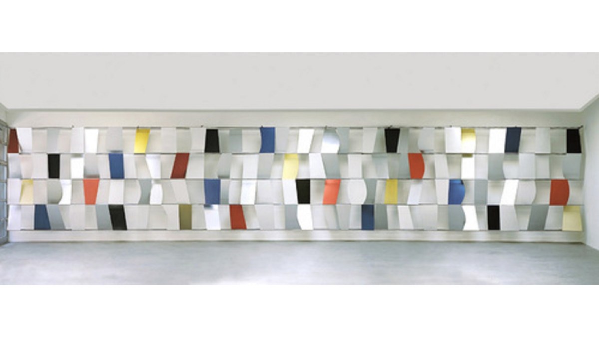 By his 30s, Kelly had already found a place in the upper tiers of American art. The 1959 MoMA exhibition Sixteen Americans — a showcase for up-and-coming talent — placed Kelly’s work alongside that of Jasper Johns, Robert Rauschenberg, Frank Stella, Louise Nevelson, and other future stars. But two years before that recognition, Kelly hit the public stage with his first major public art commission, Sculpture for a Large Wall (shown above). Originally titled Transportation Building Lobby Sculpture after its original location, the sculpture consists of 104 anodized aluminum panels painted red, blue, yellow, or black arranged in four, 65-foot-long rows.