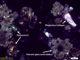 This just shows some more detail on the mineral grains and the glass shards. So, what can we say about the ash? The minerals and glass are rather blocky, which is more typical for phreatomagmatically generated shards rather than magmatically (only) generated shards. This seems to back up the idea that the explosivity of the eruption is being dominantly driven by interaction with water. However, you would really need to examine some of this ash with an scanning electron microscope (SEM) to get the full grasp on the morphology.