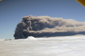 Now, so far, the eruptions at Eyjafjallajökull have been characterized as anything from strombolian to surtseyan to phreatoplinian to microplinian depending on the amount of water from the melting Gígjökull glacier involved. This will have an effect on the ash production because as we have seen, the more water involved, the more explosive the eruption seems to become. This means more fragmentation of the magma as it reaches the vent and interacts with the meltwater. However, there also appears to be a component of gases escaping from the mixed (basalt and silicic “mush”) magma itself, causing fragmentation of the magma without water. So, what does this stuff look like?