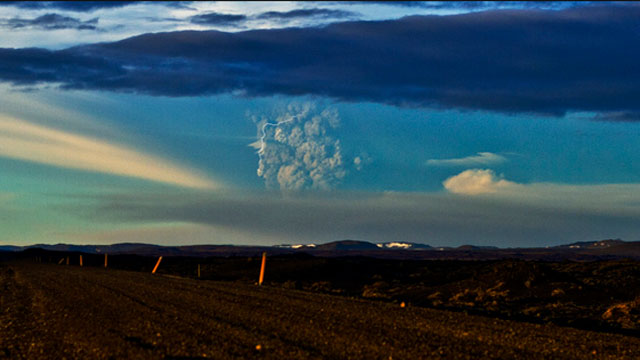 Top left: The initial ash plume from Grímsvötn seen on May 21, 2011 (click on the image to see original). Compare the size of this plume to the current plume shown at the top of the page. Image by Agust Gudbjornsson.