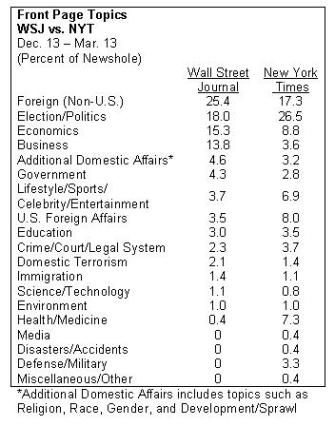 The Pew findings are part of an analysis evaluating news coverage at the Wall Street Journal before and after the take over of Rupert Murdoch (see table below). As Pew reports, the single biggest change in front-page coverage occurred with politics and the presidential campaign. Coverage more than tripled, jumping to 18% of the newshole compared with 5% in the four months before the ownership change.