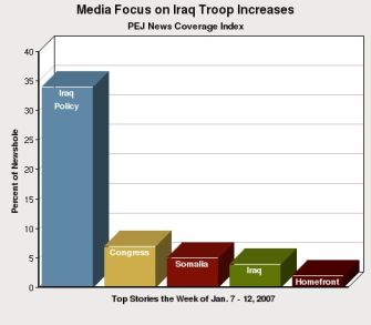 The debate over what to do next in Iraq thoroughly dominated the news landscape last week, according to the PEJ News Coverage Index. In the second week of the new year (January 7-12) Iraq policy filled 34% of the overall newshole and was the top story in all five media sectors – newspapers, online, network TV, cable and radio. That was followed by events in Congress and Somalia, and two other Iraq-related stories, but none of these even reached double digits in the main Index….