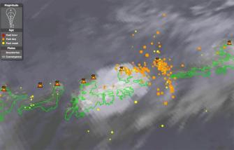 This article sums up a lot of the events that led up to the Kasatochi (Alaska) eruption last week from the point of view of the biologists on the island itself right before it erupted. There are some great descriptions of the whole island shaking for 10 minutes, and they also offer some exciting new details such as this: