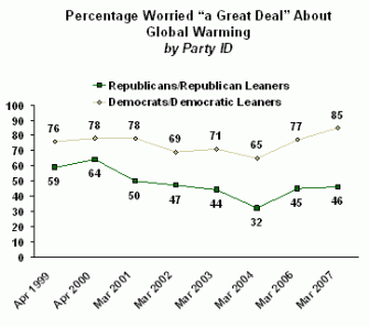 But as we describe in our framing article at Science and as I explain at NPR’s On the Media, there still remains a TwoAmericas of climate change perceptions. Over the past year Democrats have grown even more concerned about the issue while Republicans remain relatively unmoved.