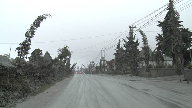 Top left: Ashfall on the streets of a village north of Merapi. Image courtesy of James Reynolds. Click on the image to see a larger version.
