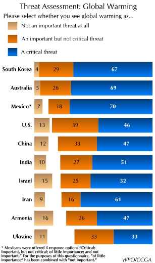 Speaking of new survey data, released today is the latest in a series of cross-national comparisons conducted by the Chicago Council on Foreign Relations. The countries captured in this latest survey include the U.S., Australia, China, India Israel, and several developing countries. Western European countries, where there is very strong public support for action on climate change, are not included in the poll.