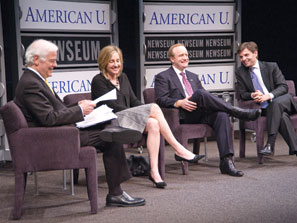 On Monday night, AU’s School of Communication sponsored a screening at the Newseum of the 1992 campaign documentary The War Room with a panel discussion that included stars George Stephanopoulos, Dee Dee Myers and Paul Begala. The event was part of the Reel Journalism film series co-sponsored by the School of Communication and the Newseum. The series is hosted by Nick Clooney, veteran broadcast journalist and father of actor George Clooney. The Politico covered the event and runs this photo of the discussion.