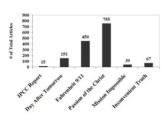 In the plotted graph, I reproduce data from the Environment study comparing news coverage of the IPCC report to the coverage of global warming generated by The Day After Tomorrow. The Environment study also compared amount of media attention to other major films released in 2004. I add news attention to Al Gore and Inconvenient Truth, but also compare the news attention to the documentary to the news attention generated by Tom Cruse and Mission Impossible III.