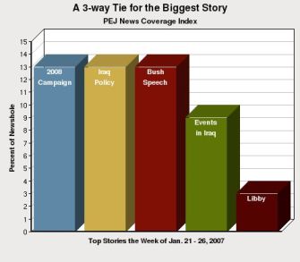 As the Pew analysis (pictured above) of last week’s major stories indicates, Iraq continues to dominate headlines, while 2008 horserace speculation comes in a close second. Up against these juggernaut narratives, the IPCC release is unlikely to compete for air time and column space. Nor is it likely to break through the powerful partisan lenses of the American public, with striking differences in the perception of reality across party lines.