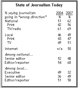 Last week Pew released an in depth survey of national and local print and TV reporters, editors, and producers. Among the findings, Pew describes that journalists at national news organizations have become considerably more pessimistic about the state of their profession since 2004. By roughly two-to-one (62%-32%), more national journalists say that journalism is going in the wrong direction rather than the right direction.