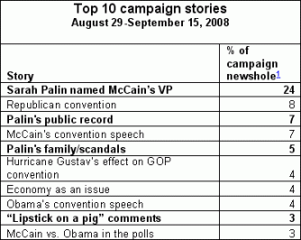 Yet as a Pew analysis released this week finds, although Palin has dominated campaign coverage since the GOP convention (top), few if any stories in the mainstream media have examined the relevancy of her religious faith (bottom). The exception, as Pew observes, is the Evangelical media, which have triumphantly celebrated one of their own ascending to a place on the GOP ticket.