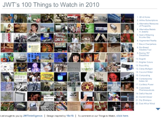 In business, new opportunities often result from the ability to capitalize on an emerging cultural trend. When it comes to spotting this intersection of culture and commerce, advertising & communications agency JWT is unparalleled. With its slogan of “converting cultural shifts into opportunities,” JWT has once again published its annual “100 Things to Watch” feature that points out the people, technologies and cultural trends that will likely impact our lives over the next year. My favorite JWT picks for 2010 include the following: