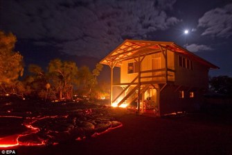Lava flows from Kilauea in Hawai`i move towards a home in Kalapana.
