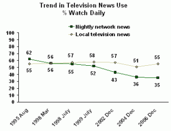 However, since 2002, regular Network TV news and Cable TV news viewing has declined to 35% and 34% of Americans respectively. I would like to see these trends go back further than 2002. At that time, following the September 11 attacks and the invasion of Afghanistan, news consumption surged. So the decline in 2006 may just reflect a “normalization” in media behaviors.
