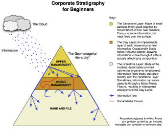 Obviously, something happened to the culture of the company, changing the very direction of what it means to work at Microsoft. One way to conceptualize this is to think about the “impenetrable layer of suck” that tends to grow at just about every company — especially those already bloated with layer upon layer of middle management. On her Strange Attractor blog, Suw Charman-Anderson has posted a fantastic graphic showing how this “impenetrable layer of suck” works. Creative ideas never quite make their way down through an organization. Note the squiggly red lines that are the “social media fissures” — these are just about the only way that innovative ideas work can find their way down to the rank-and-file members of an organization.