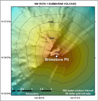 nnFor those of you interested in what happens in the realm of submarine volcanism, I can pass on some tidbits I’ve gotten about NW-Rota 1, a submarine volcano in the Mariana Islands (see bathymetry above). Dr. Ed Kohut (Petrogenex), a friend of mine from my days at Oregon State Univ., is currently on a JAMSTEC research cruise in the Mariana Islands, visiting the area about NW Rota-1. He reports:n