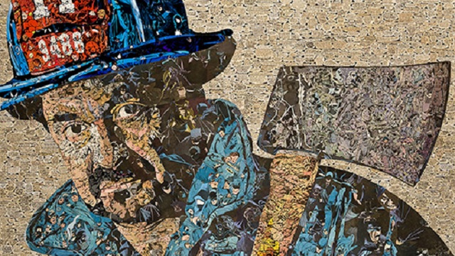 “The life-changing events of 9/11 led us all to believe in the need for real life superheroes,” Turnbull explains. “Superman didn’t fly down to save the falling buildings, there was no Caped Crusader ready to do battle with the arch-enemy and Spidey didn’t spin his web. Without the need of a phone-booth or a revolving door these true patriots donned their iconic costumes and sacrificed life and limb for what they believed in. With every cut-comic hero and dialogue I hope to bring out the true merits of the Brave and the Bold in their fight for Truth, Justice and the American Way.” Turnbull builds a palette of red, white, and blues by cutting up a thousand pre-1990s comic books featuring characters such as Spider-Man, Batman, Daredevil, Captain America, and The Fantastic Four as drawn by Jack Kirby, Steve Ditko, Sal Buscema, and others. The tiny faces of familiar characters almost disappear into the collage until you look closely enough to see, for example, a section of blue to be composed of tiny Batmen and Captain Americas.