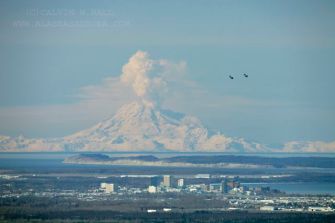Redoubt in April 2009 with Anchorage in the foreground (along with two F-22 Raptors). Image courtesy of Calvin Hall.