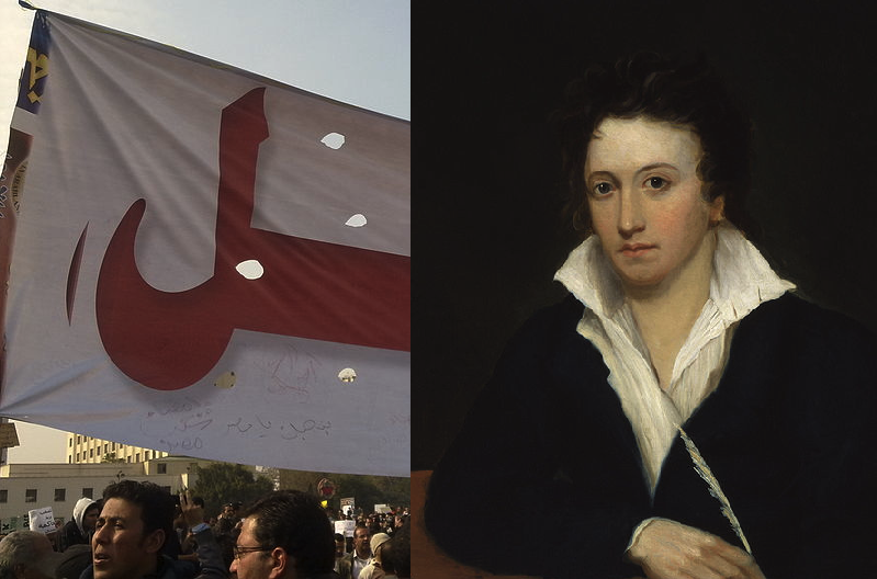 Now, I’m not suggesting that all historical events stem directly from poetry, or that we should start scouring anthologies for potential solutions to world crises. (Actually, many well-known poets have been notorious political wingnuts—Ezra Pound creeps to mind.) I would argue, though, that Shelley’s “Masque” is far from an isolated case. Literature is often reduced in the general public’s eyes to a quaint academic pursuit, or a noble but remote spiritual undertaking, or a single specialty “genre” among many. Think of it instead as an underground cultural wellspring that bubbles up everywhere, from Hollywood (quick, name five great movies that aren’t adapted from books or plays) to political oratory, from our everyday turns of phrase to the extraordinary events of Tahrir Square.