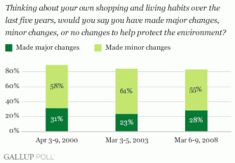 Despite record amounts of media attention and ever certain science about threats to the environment, Americans’ commitment to taking environmentally sustainable actions remains little changed over the past eight years. In the first of their annual Earth Day survey reports, Gallup finds that only 28% of Americans say that they have made major changes in their lifestyles to protect the environment. This proportion is little changed over the 31% in 2000.