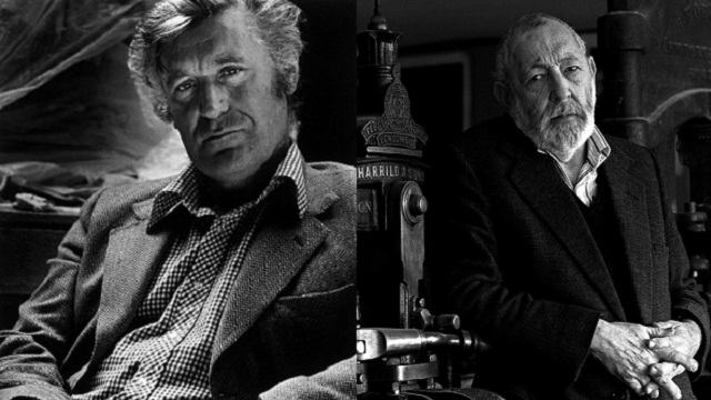 [Images: (Left) Ted Hughes in Leonard Baskin’s studio, Devon, England, 1979, © Noel Chanan. (Right) Leonard Baskin, Northampton, Mass., 1991 © Noel Chanan.]