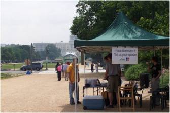 Changing the conversation about climate change: Graduate students from American and George Mason Universities prepare interview tent on the National Mall.