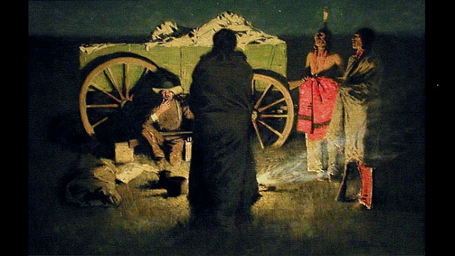 The court painter of American gun culture remains Frederic Remington. No relation to Remington Arms Company, the largest producer of shotguns and rifles in America and one of the biggest firearms makers in the world, Remington the painter glamorized the cowboys of the Wild West in paintings and sculptures. Paintings such as 1908’s Shotgun Hospitality (shown above) imply that a cowboy’s best friend was his “shooting iron,” the only hospitality that “Injuns” could or should expect from a white man. I’ve always found Remington’s paintings beautiful frauds—a vision of history that simplifies what really happened in a way that remains destructive even today. Perhaps the most absurd image by Remington is his 1892 watercolor Buffalo Hunter Spitting a Bullet into a Gun, which delivers exactly what the title says, with the added improbability of reloading a rifle by spitting a bullet down the barrel while riding a galloping horse. Yet, somehow, we’re expected to swallow such images as history—a history centered on the mystique of the gun. Unfortunately, we as a culture have swallowed such visual rhetoric whole.