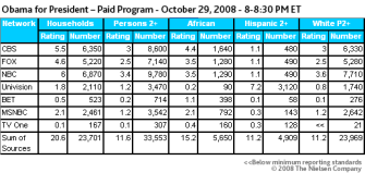 Obama took over the airwaves Wednesday night, hitting most of the important audience groups. According to Nielsen (above), Obama’s 30 minute 8pm infomercial which aired on CBS, FOX, NBC, Univision, […]