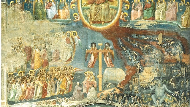 Giotto placed his hidden devil directly beneath St. Francis as he ascends to his rightful place in heaven on clouds of glory. Giotto’s devilish humor may have driven him to insert this satanic touch as an “inside joke” the masses walking beneath would never notice. The Penn State story is no joke, of course, but Sandunsky, the devil in the mural of that campus’ life, now takes on a new significance perhaps similar to Giotto’s demon. By placing the devil directly beneath the shining image of St. Francis’ goodness, does Giotto imply that evil can exist in the most unlikely places? Rather than a silver lining, does every heavenly cloud harbor a dark, demonic interior?