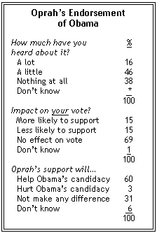 In today’s political world, it’s the law of small numbers. Not only in the general election, but especially in the upcoming state primaries. If Oprah’s viewers suddenly turn up to vote in these primaries, diluting the concentration of liberal party faithful who traditionally dominate the selection process, in some states, the 1% to 2% gain is what Obama might need to win.