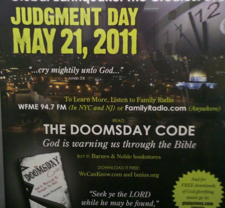 I realize that most people who believe “the end is near” do so because it’s what they were told to believe by their family, religious figures, and friends. Few people would reach such a system of belief without these influences. In fact, a very small portion of the population do so even with these influences. That is, I think, a credit to humanity (if a fairly feeble one). And I pity the people who believe so fervently the end is coming that they give up all security in their lives: savings, jobs, homes, etc. Those things are “only material,” of course, but when you expect to be around for awhile and you’re not accustomed to the life of an ascetic monk, it’s tough getting along without them. It’s even worse when your children are trapped into such a condition when they had no choice in the matter. I truly hope that now, and indefinitely into the future, for each failed doomsday prophecy there are a few disillusioned believers who find in their continued existence greater appreciation for the experiences and relationships life makes possible for each of us. In fact, that’s a worthy hope for everyone on Earth.