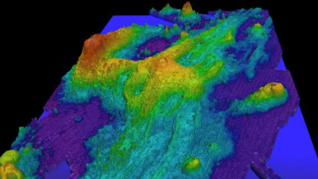 Top left: A sonar image of Axial Seamount off the coast of Oregon.