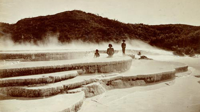 Top left: Bathing in the now-buried Pink Terraces near Tarawera in New Zealand. The terraces, thought to have been destroyed in 1886, have been located 60 meter under the surface of Lake Rotomahana.