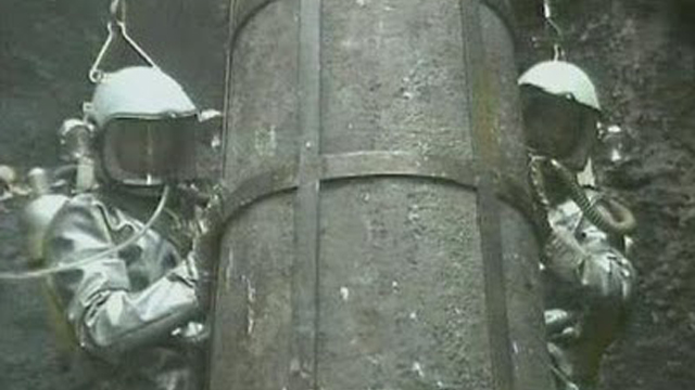 Top left: Lowering a nuclear bomb into a Pacific volcano in order to start an eruption in 1965’s “Crack in the World“.