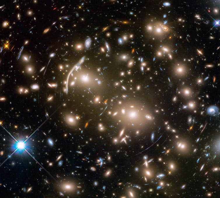 If we look at galaxy clusters nearby (relatively speaking, of course), we can see dramatic proof that Einstein was right when he asserted that mass curves space. One of the prettiest examples which reveals this warping of space can be seen in Hubble’s image of Abell 370, released in 2017.